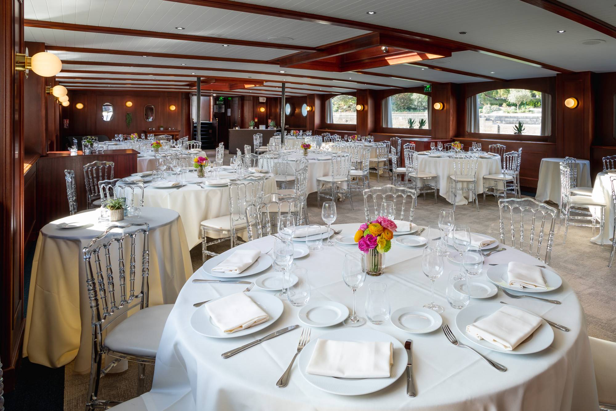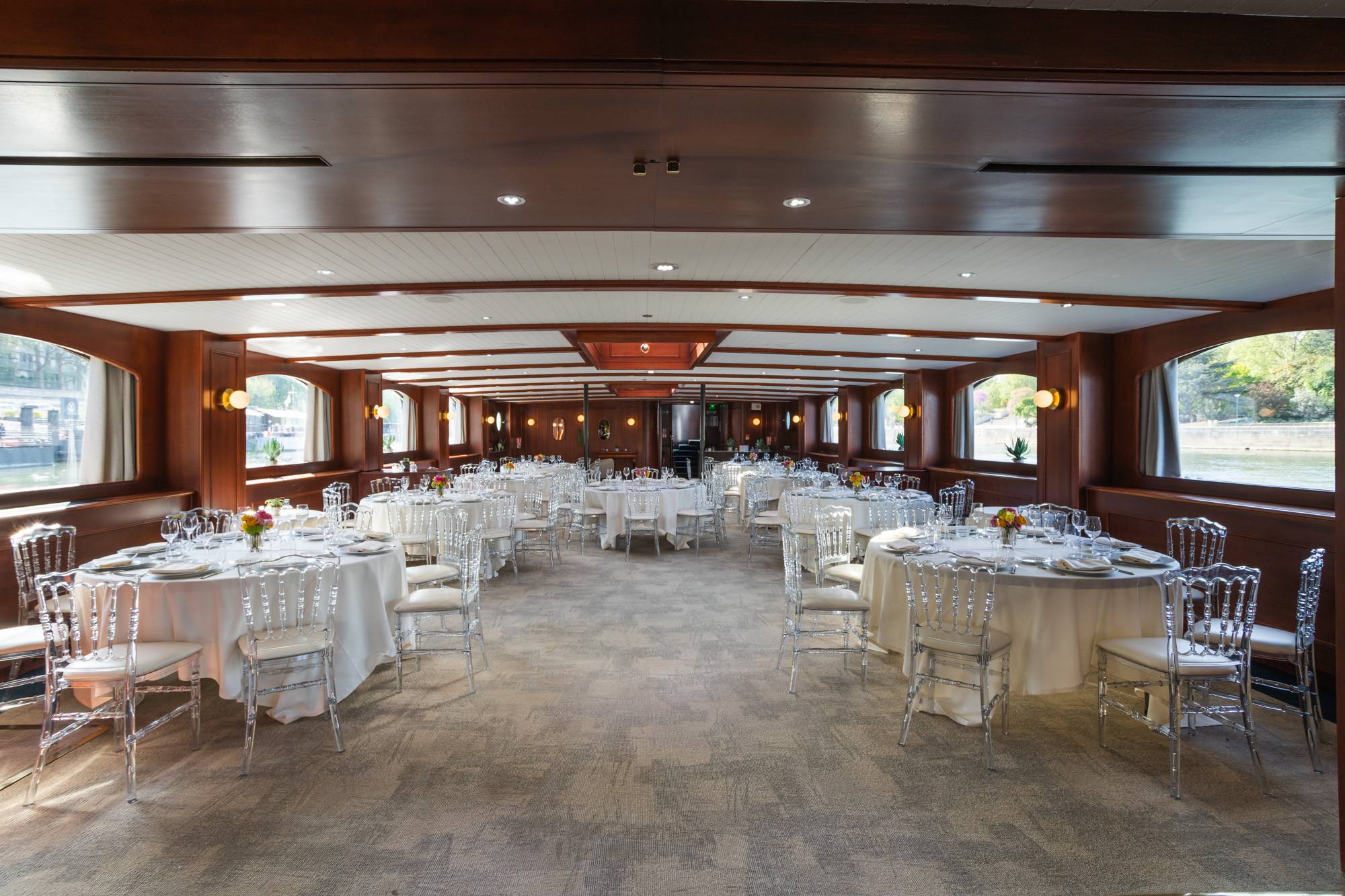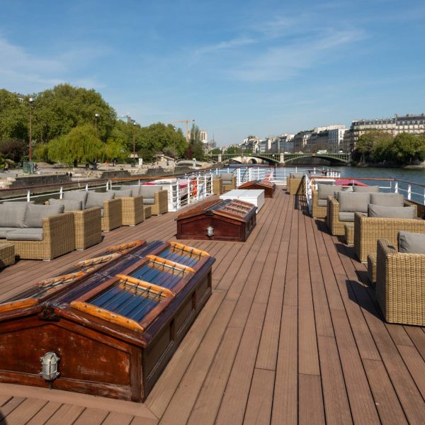 Cette péniche est le lieu idéal pour ceux qui recherchent luxe et excellence lors d’une réception haut de gamme. Offrant des prestations raffinées, elle accueille vos événements dans un cadre élégant et sophistiqué. Son intérieur feutré, habillé de matériaux nobles tels que le bois et le cuir, séduit par son charme discret et son atmosphère chaleureuse. Un vaste bar intérieur sublimera votre cocktail, tandis qu’une grande terrasse aménagée avec du mobilier de qualité vous permettra d’admirer pleinement la beauté de Paris.