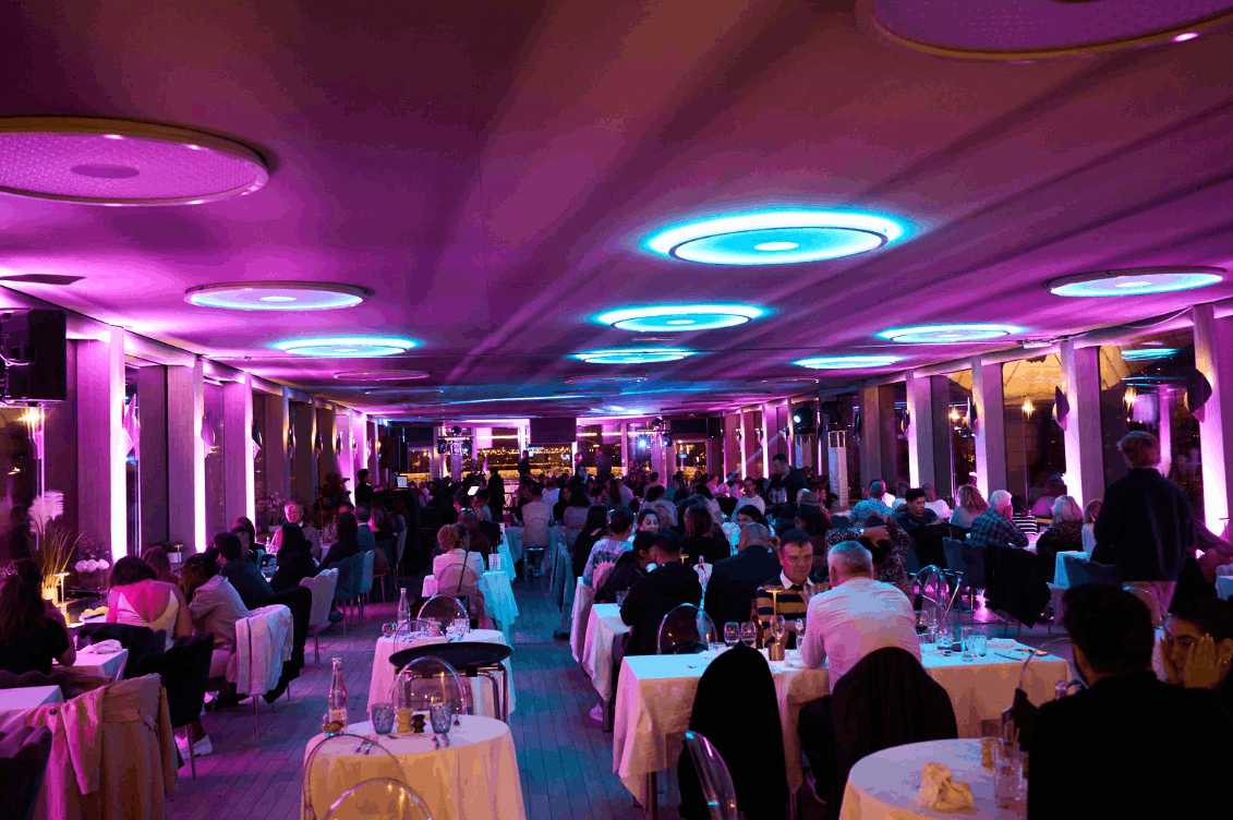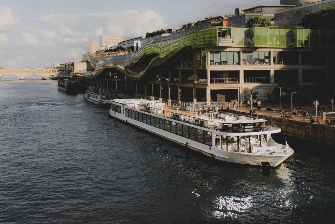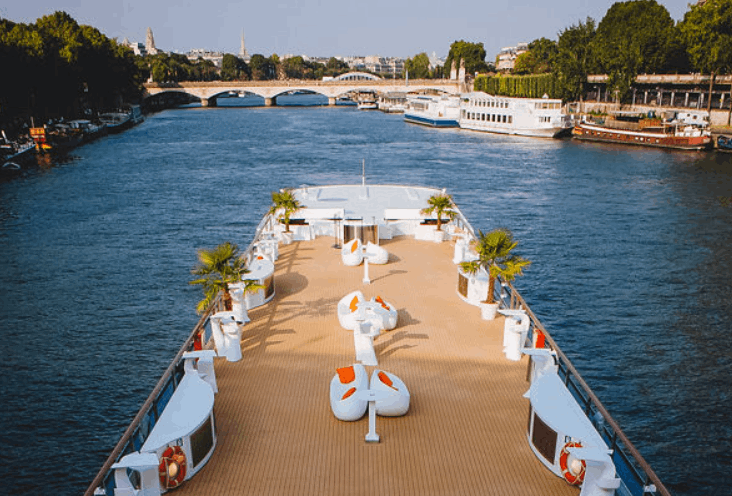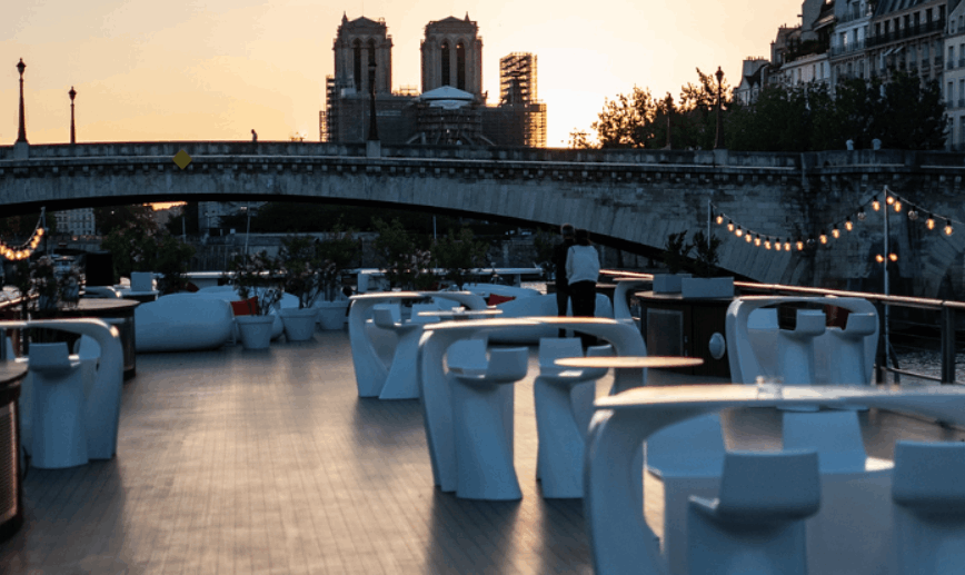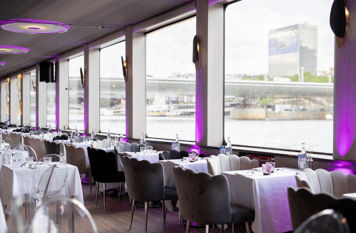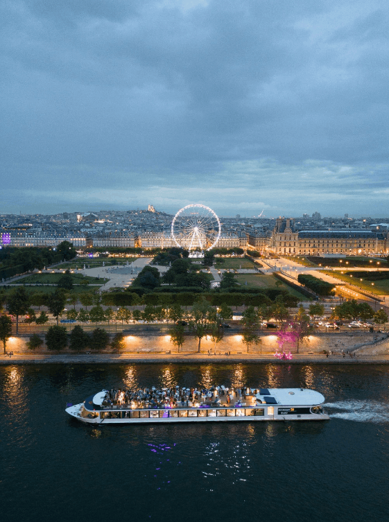 Ce bateau moderne de grande capacité offre une vue spectaculaire sur Paris grâce à sa structure entièrement vitrée. Sa vaste salle de réception, située de plain-pied, peut accueillir jusqu’à 450 personnes dans un cadre élégant et fonctionnel. Véritable atout du lieu, son imposante terrasse située sur le pont supérieur — quasiment aussi longue que le bateau — permet à vos invités de profiter pleinement du panorama parisien. À l’intérieur comme à l’extérieur, ce bateau garantit une expérience mémorable à tous vos convives.