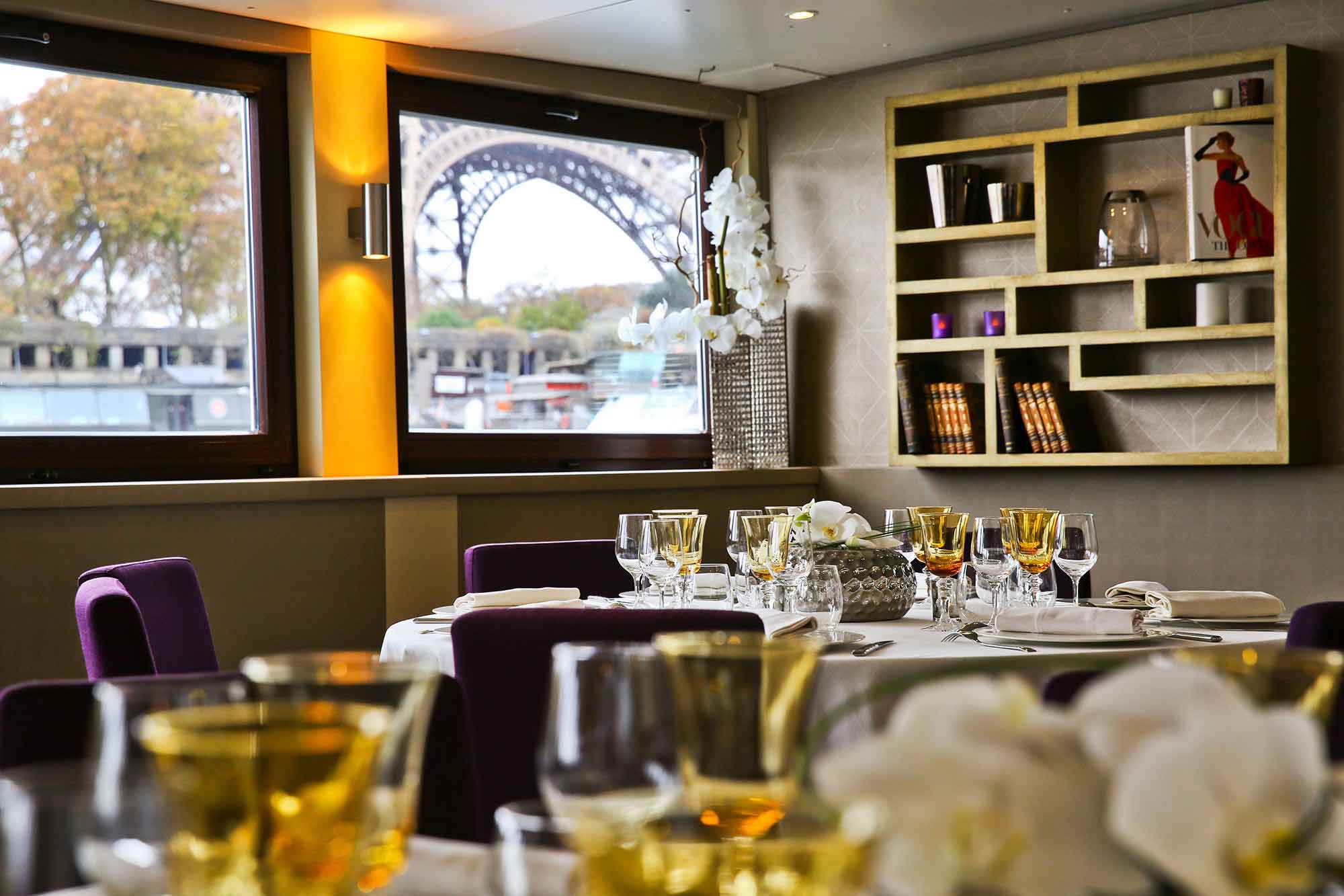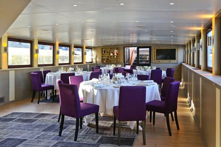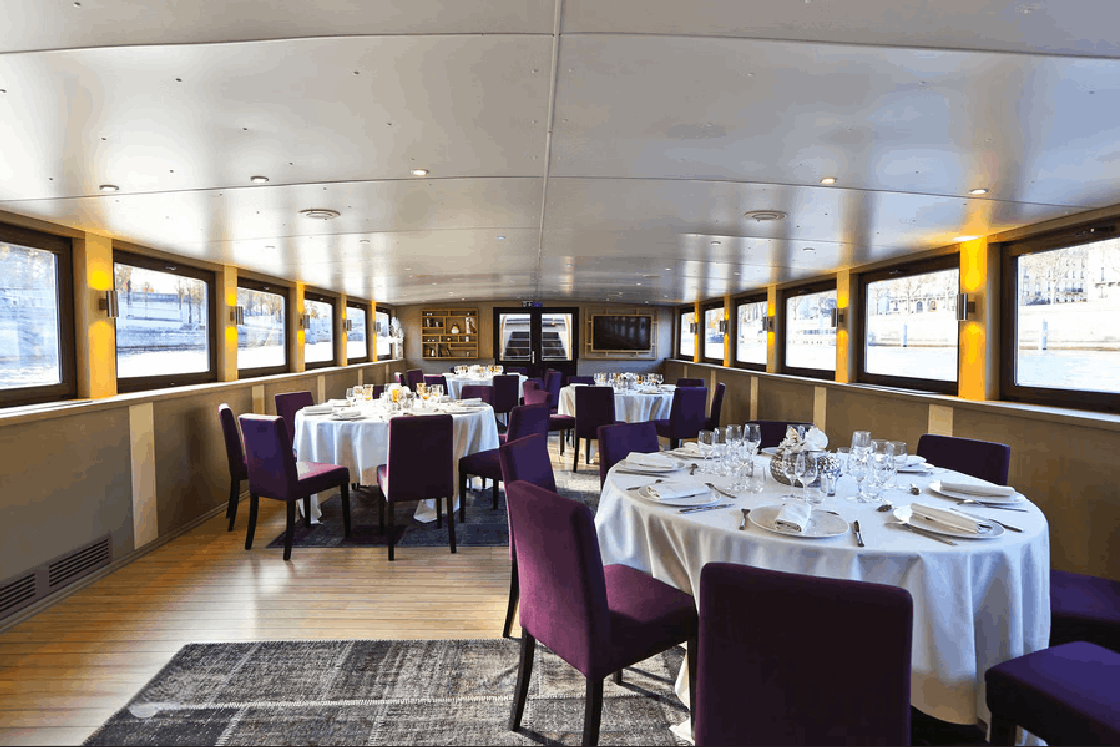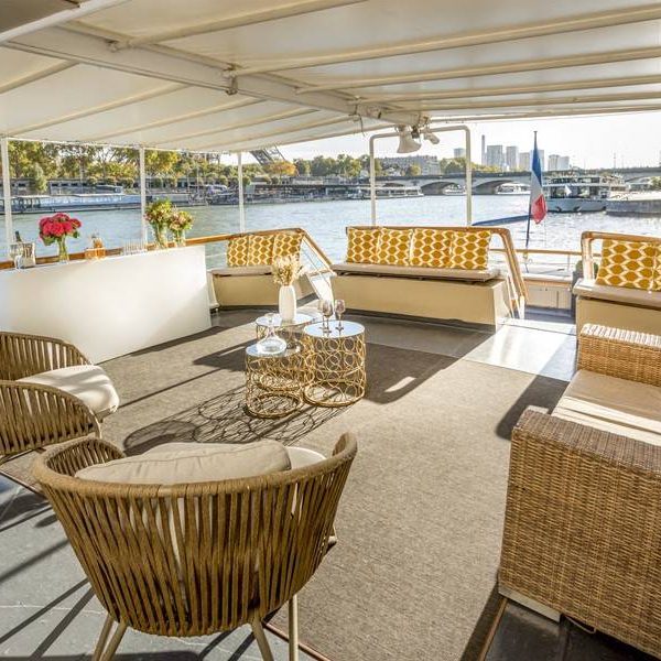 Cette péniche, mise en valeur par de raffinées boiseries, séduit par son atmosphère intemporelle, son élégance et sa décoration soigneusement élaborée. Vous pourrez déguster un dîner dans une salle chaleureuse avant de prolonger votre réception sur sa terrasse entièrement aménagée. Ses deux espaces extérieurs offrent un cadre idéal pour admirer la vue et profiter pleinement de votre croisière à Paris.