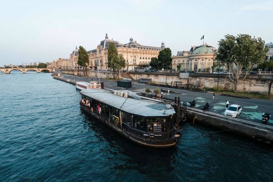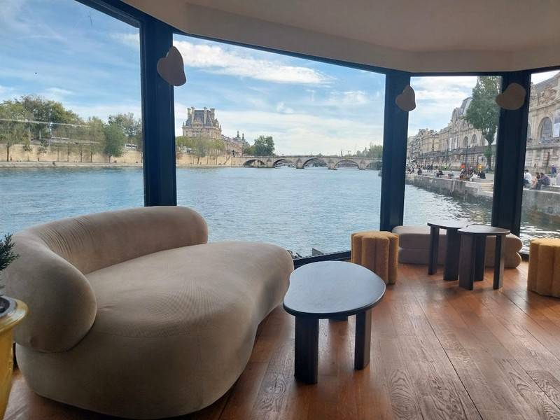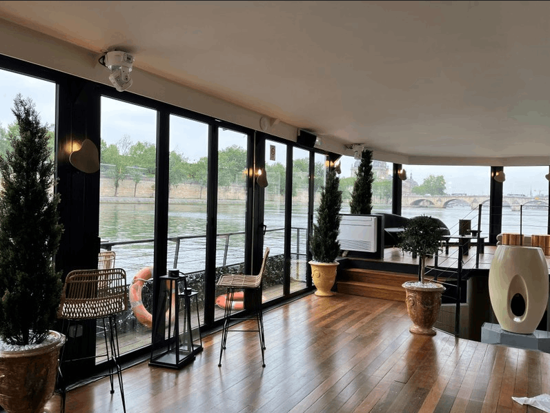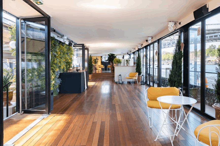 Conçu pour offrir un véritable havre de bien-être et d’évasion, ce ponton propose un espace modulable selon vos besoins et vos envies. Idéal pour accueillir aussi bien vos événements professionnels que privés, cette péniche à quai se compose de deux espaces complémentaires : une terrasse flottante et une péniche végétalisée dotée de larges baies vitrées offrant une superbe vue sur la Seine. Vous pourrez y recevoir jusqu’à 200 convives pour un cocktail. La terrasse flottante évoque un jardin méditerranéen à ciel ouvert durant l’été, où vous profiterez de la brise et du soleil, tandis qu’en hiver elle se transforme en un véritable jardin d’hiver, cosy et baigné d’une lumière chaleureuse. Entièrement vitré, le bateau offre une vue panoramique exceptionnelle sur la Seine et sur les musées du Louvre et d’Orsay, garantissant une expérience unique au cœur de Paris.