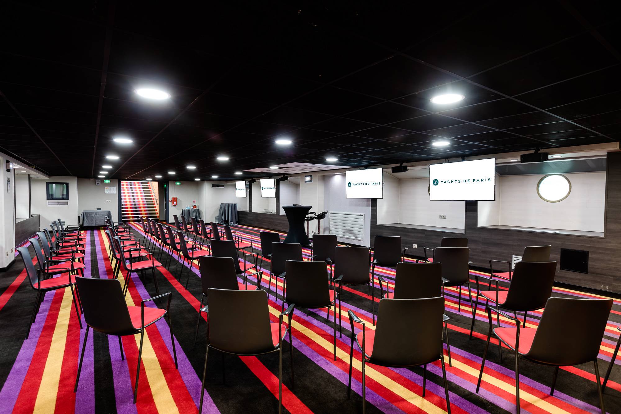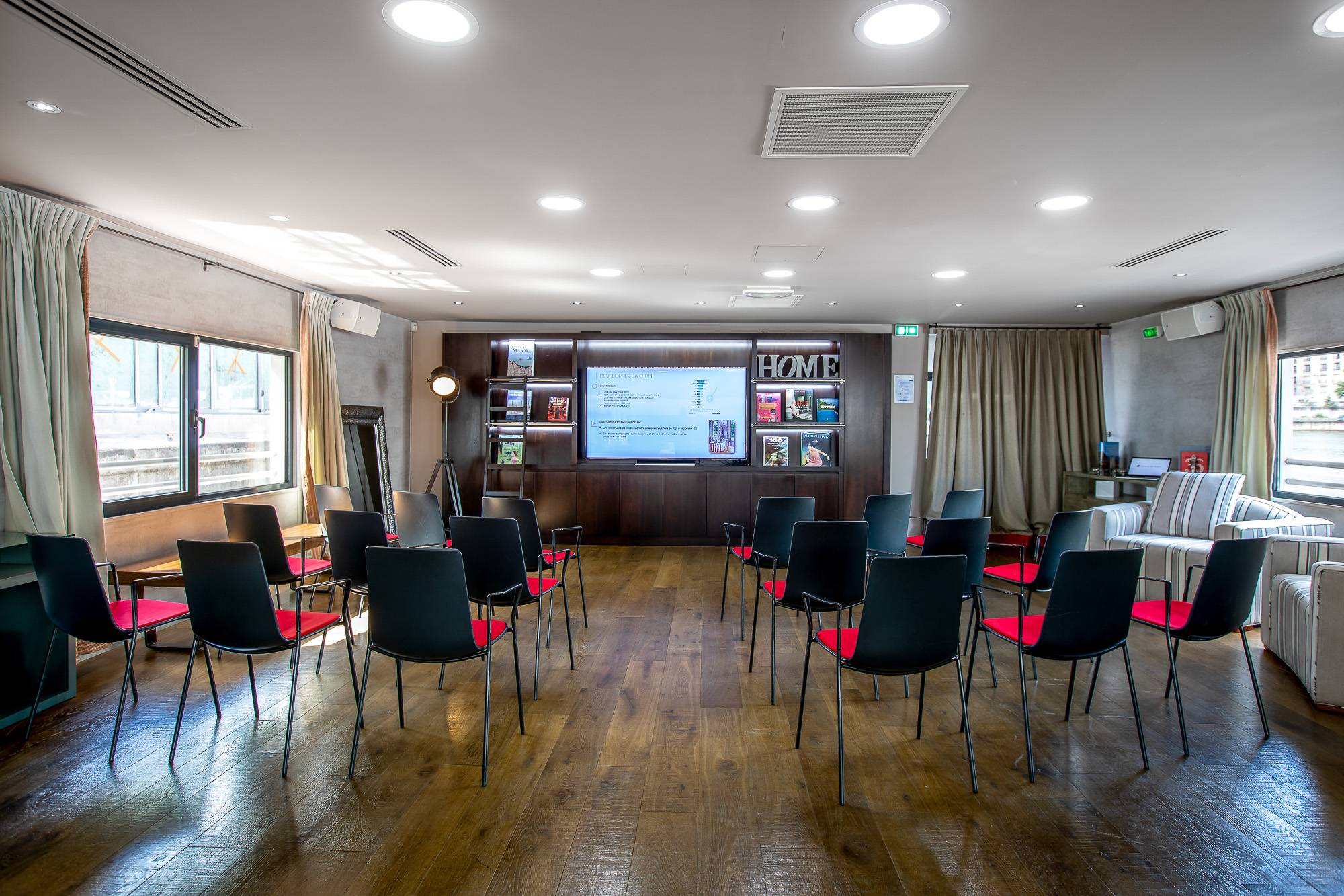 Cette péniche à quai, aménagée sur deux niveaux distincts, constitue un lieu idéal pour organiser un séminaire original et haut de gamme. Le pont inférieur propose une salle de séminaire entièrement équipée, dotée de cinq écrans et de l’ensemble des technologies nécessaires pour accueillir jusqu’à 120 participants en plénière. À l’étage, le pont supérieur se transforme en un vaste loft parisien luxueux, offrant un cadre chaleureux et convivial pour rapprocher vos invités et valoriser votre réception. Dans cet environnement élégant où le service est résolument premium, vous bénéficierez également d’une vue exceptionnelle depuis la terrasse, notamment sur la Statue de la Liberté parisienne et la Tour Eiffel. Ainsi, même à quai, cette péniche garantit à vos convives une expérience unique et un panorama d’exception.
