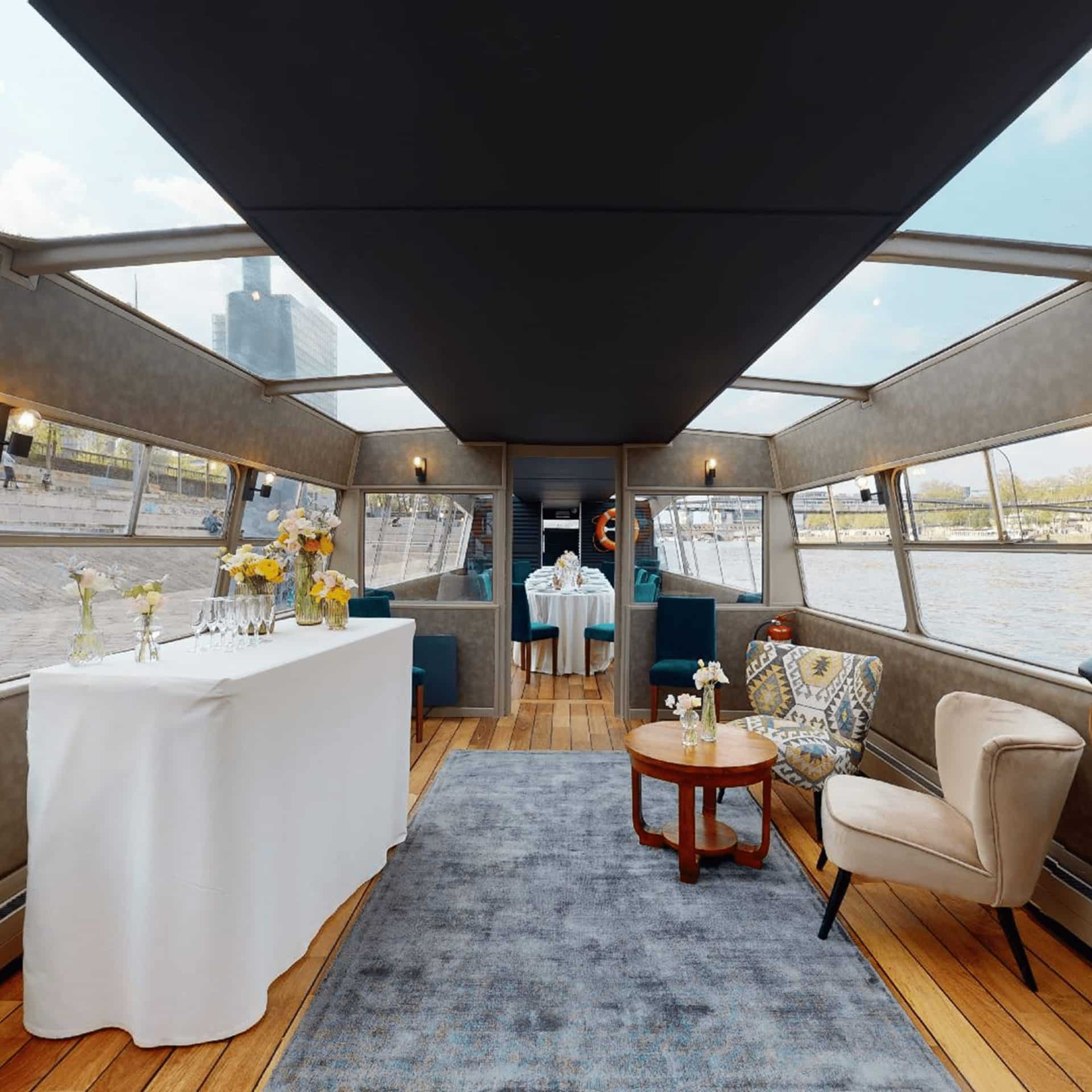 Cette péniche de caractère, au style extérieur rétro et à l’intérieur chaleureux et intimiste, constitue un cadre idéal pour des rassemblements en petit comité. Elle offre également deux salons attenants et communicants.